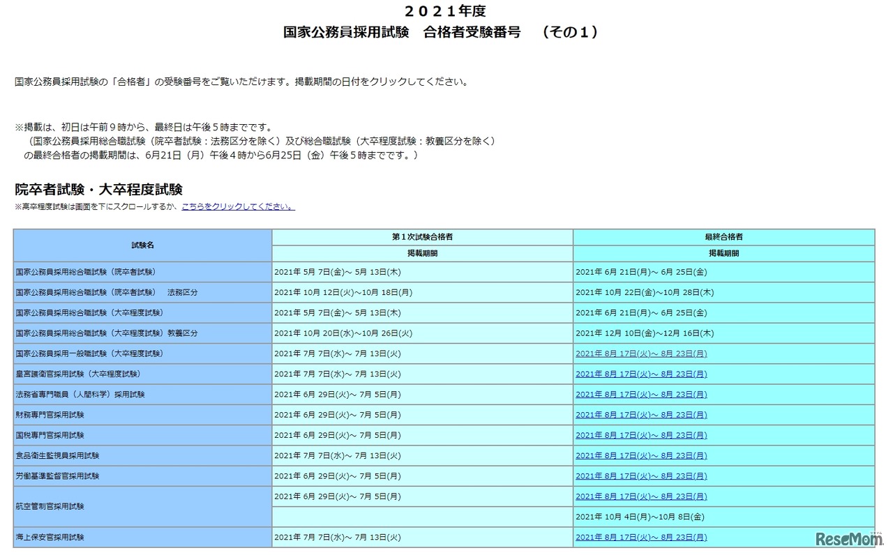 人事院は2021年8月17日、国家公務員採用一般職試験(大卒程度試験)と専門職試験(大卒程度)の合格者を発表した。倍率は、一般職試験が3.6倍、専門職試験のうち皇宮護衛官が17.7倍。合格者の受験番号が人事院のWebサイトに掲載されている。