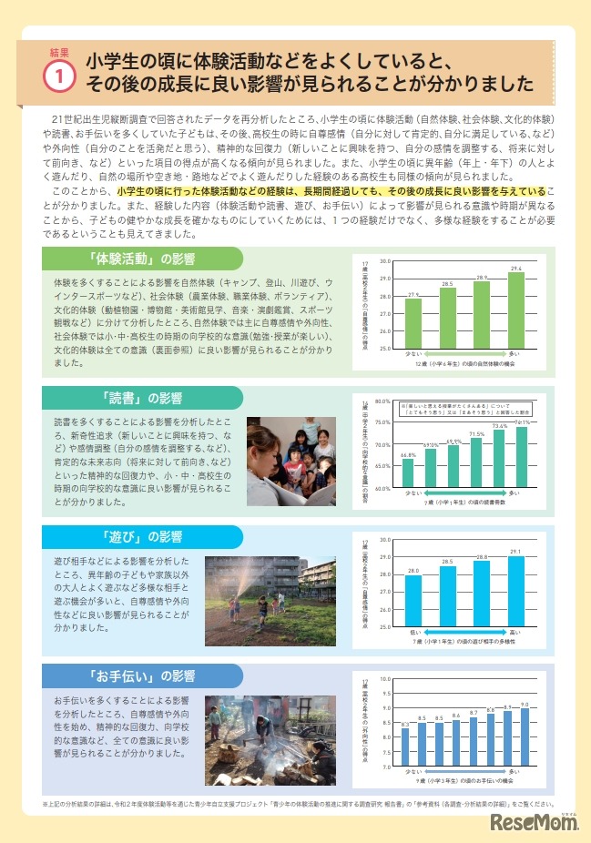 小学生のころに体験活動や読書、お手伝いを多くしていた子供は、家庭の環境に関わらず、高校生になって自尊感情や外向性、精神的な回復力といった項目の得点が高くなる傾向にあることが、文部科学省が2021年9月8日に発表した調査結果より明らかになった。