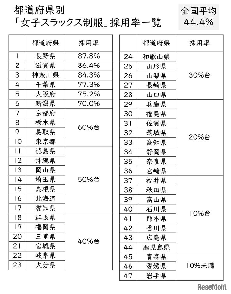 学校総選挙プロジェクトは2021年9月9日、都道府県立の全日制高校3,205校を対象に初めて実施した「選べる制服」採用率の調査結果を発表した。女子スラックス制服を採用しているのは44.4%。都道府県別では、長野県の87.8%がもっとも高かった。