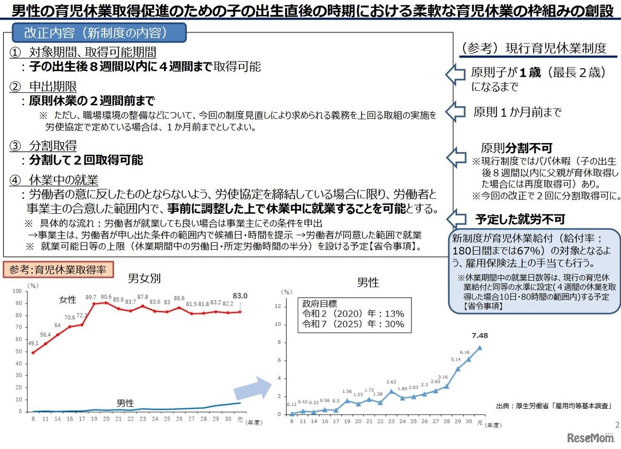 出産直後の時期に男性が柔軟に育児休業を取得できるようになる改正育児・介護休業法が2021年9月21日、閣議決定された。新制度では、男性は子の出生後8週間以内に4週間まで育児休業が取得でき、2回までの分割取得も可能になる。