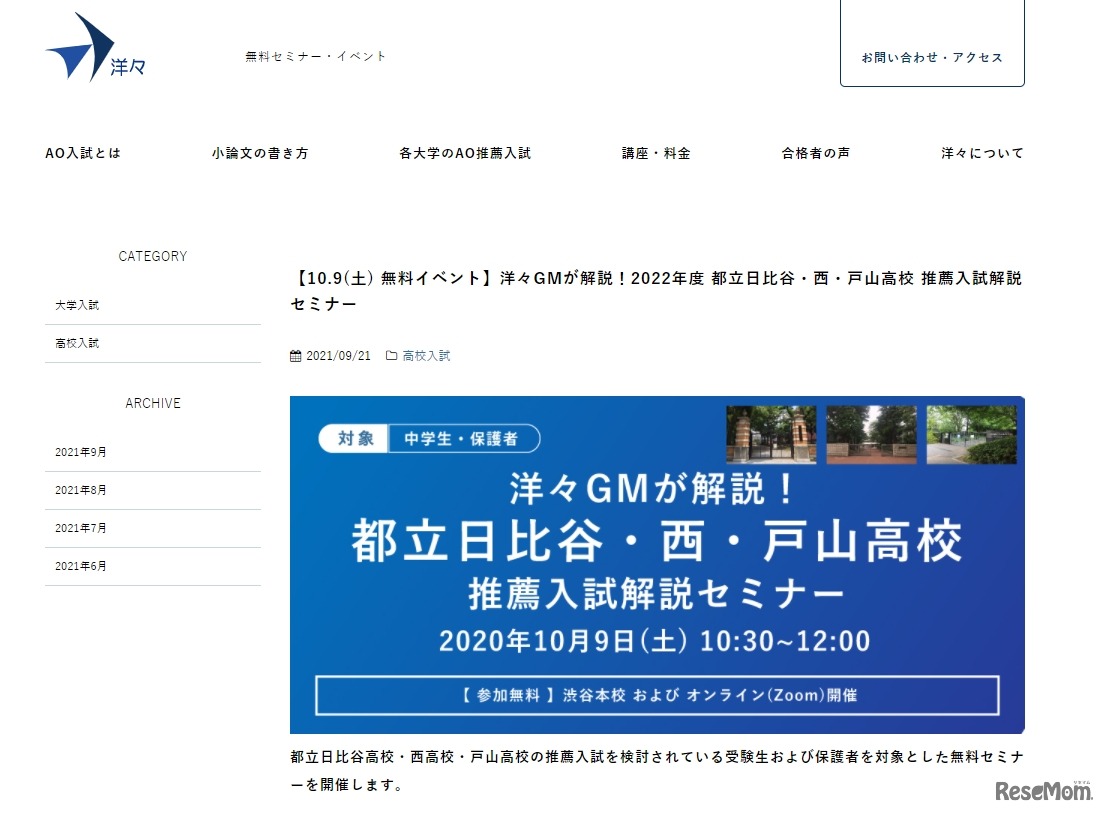 高校推薦入試・小論文対策の個別指導を手がける洋々は、2021年10月9日に無料セミナー「洋々GMが解説!2022年度都立日比谷・西・戸山高校推薦入試解説セミナー」を開催する。