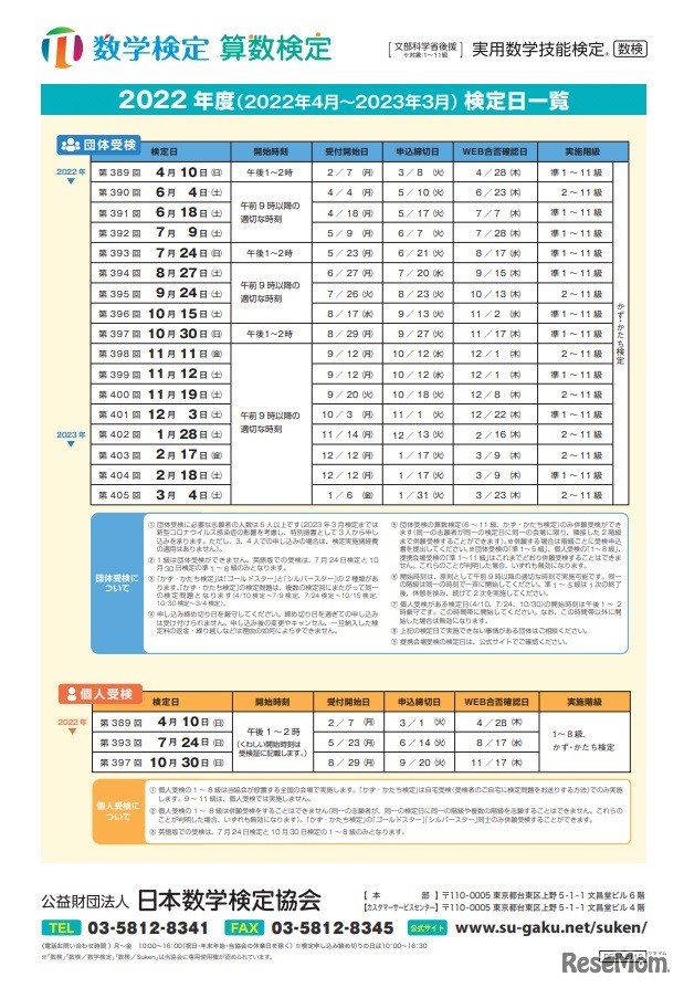日本数学検定協会は2021年10月1日、2022年度の実用数学技能検定「数検」の検定日を公表した。個人受検は、4月・7月・10月に実施する。