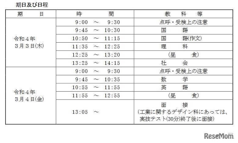 画像出典:愛媛県教育委員会「令和4年度愛媛県県立高等学校入学者選抜実施要項」 一般入学者選抜 学力検査の期日と日程