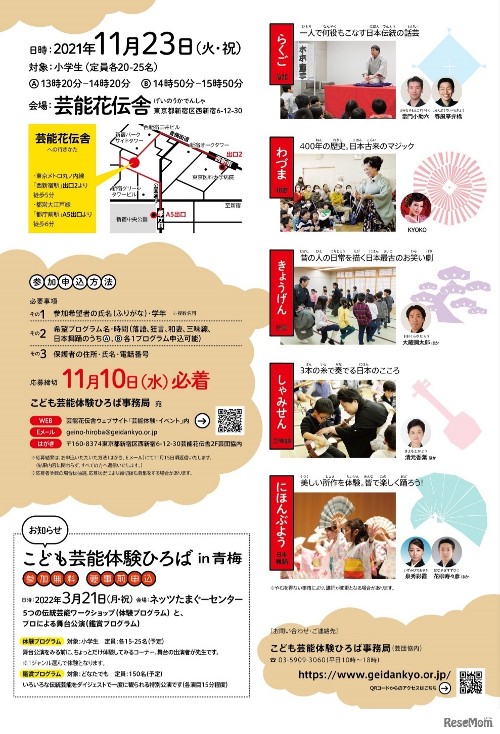 東京都と東京都歴史文化財団、こども芸能体験ひろば実行委員会は、日本の伝統芸能が体験できるワークショップ「こども芸能体験ひろば」を、2021年11月23日に芸能花伝舎(新宿)、2022年3月21日にネッツたまぐーセンター(青梅)にて開催する。参加無料・事前申込制。