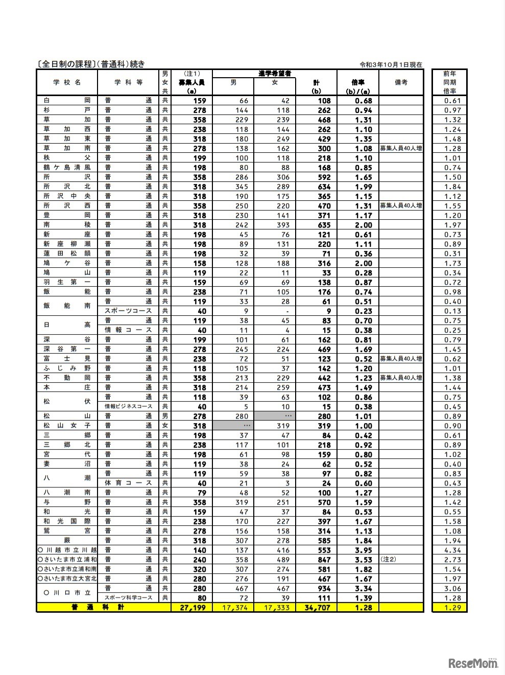 埼玉県教育委員会は2021年10月28日、2022年3月中学校等卒業予定者の進路希望状況調査(10月1日現在)の結果を公表した。学校・学科別の希望倍率では、市立川越(普通)3.95倍、市立浦和(普通)3.53倍等が高かった。
