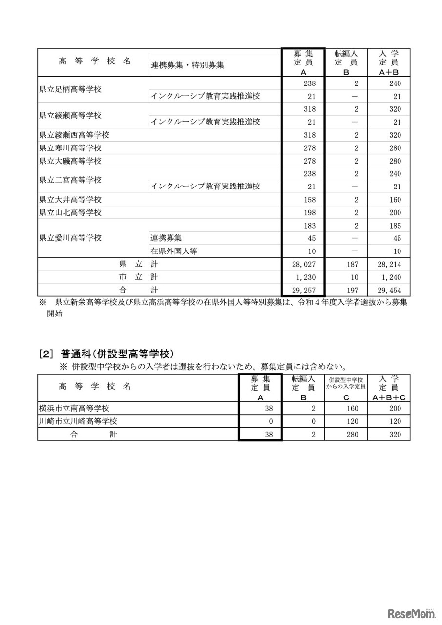 令和4年度神奈川県公立高等学校生徒募集定員について【全日制の課程 各校の募集定員】