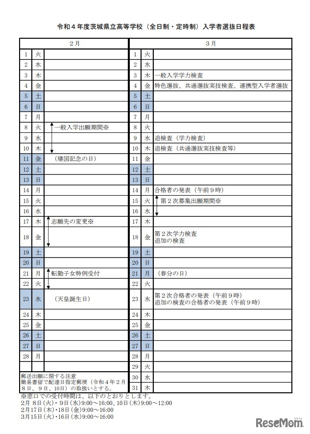 2022年度 茨城県立高等学校(全日制・定時制)入学者選抜日程表