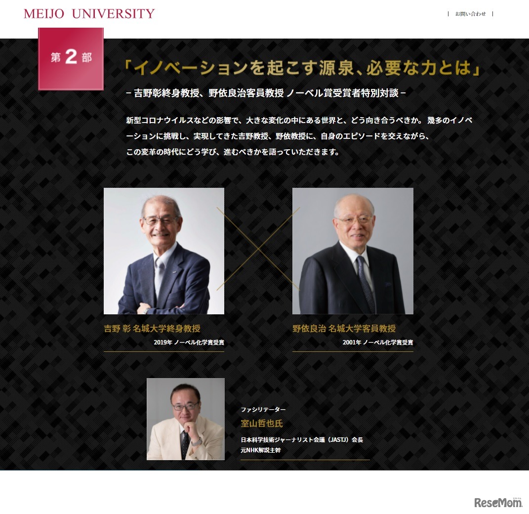 名城大学は2021年12月11日、天白キャンパスの名城ホールで、「吉野彰終身教授ノーベル賞受賞記念講演会」を開催する。2001年にノーベル化学賞を受賞した同大の野依良治客員教授との対談。対面とオンラインで実施。参加料無料、要事前申込み。
