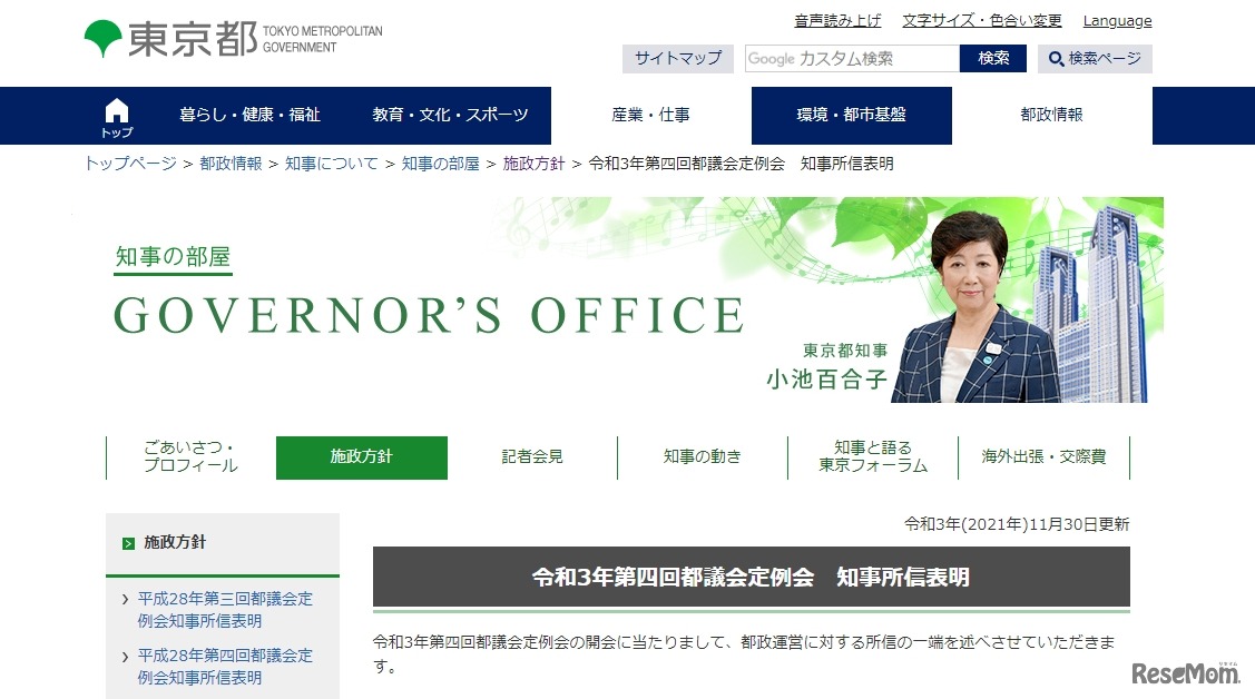 東京都は2021年11月30日、第4回都議会定例会を開会した。小池百合子知事は所信表明で、2022年度からの都立高校における1人1台端末の導入に向け、端末購入時の保護者負担を3万円の定額負担とする、全世帯を対象とした補助制度を創設すると述べた。