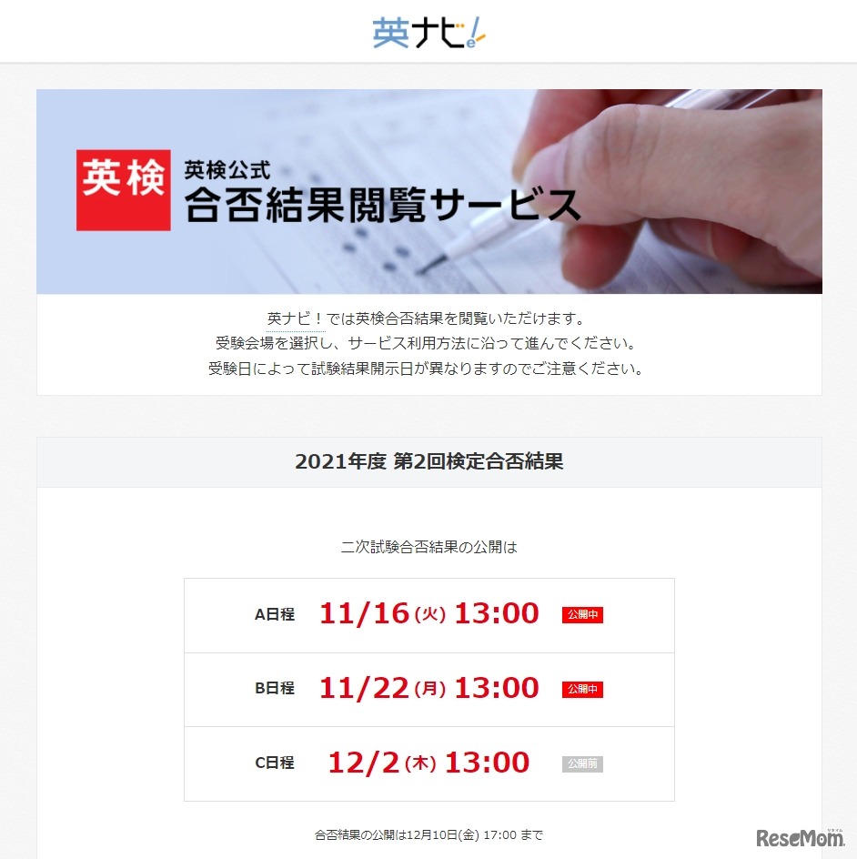 日本英語検定協会は2021年12月2日、Webサイトで「2021年度第2回実用英語技能検定二次試験」C日程の合否閲覧サービスを開始した。団体責任者は午前11時以降、個人(英ナビ!会員)は午後1時以降に公開する。