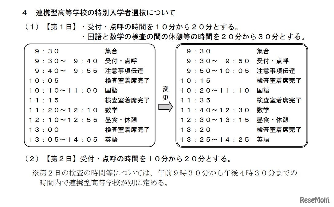 本検査当日の検査時間割の変更(連携型高等学校の特別入学者選抜)