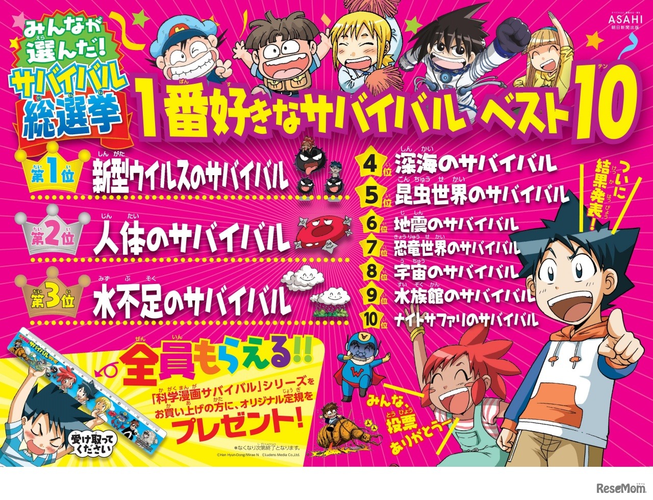 朝日新聞出版は2021年12月3日、「科学漫画サバイバル」シリーズ史上初となる「キミが好きなサバイバルはどれ?サバイバル総選挙」のベスト10を発表した。1位には、新型コロナウイルスによる関心の高まりから「新型ウイルスのサバイバル」が選ばれた。