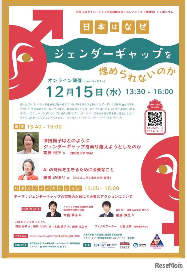 電気通信大学は2021年12月15日に、シンポジウム「日本はなぜジェンダーギャップを埋められないのか」を開催する。講演とパネルディスカッションを実施。オンライン開催ウェビナーを使用。全国どこからでも参加することができる。要事前申込み、参加費無料。