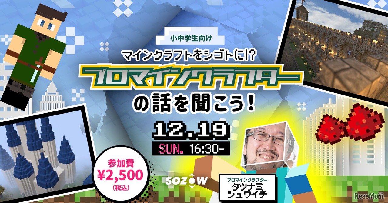 Go Visionsが運営する小中学生向けオンラインの学び場「SOZOW」は、12月19日にプロマインクラフターのタツナミシュウイチ氏をゲストに迎え、直接話を聞ける特別イベントを開催する。小中学生向けで、小学1、2年生は保護者同席で参加可。参加料2,500円。
