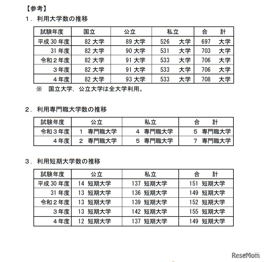 画像出典:大学入試センター 利用大学・専門職大学・短期大学数の推移