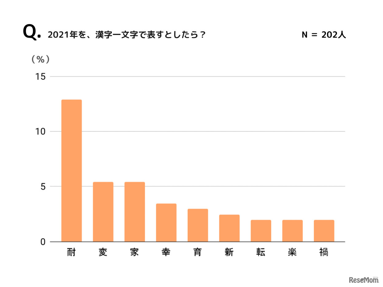 2021年を表す「保護者が選ぶ漢字」は、1位「耐」、2位「変」「家」、3位「幸」であることが、千が行った「漢字に関する保護者の意識調査」の結果より明らかになった。コロナ禍を連想する漢字が並ぶ一方、「楽」「愛」等のポジティブな漢字も選ばれている。