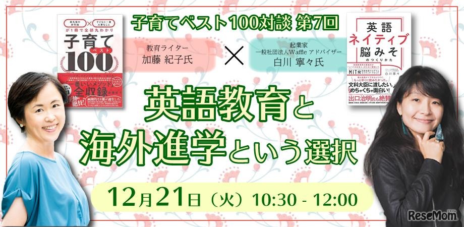 花まる子育てカレッジは、2021年12月21日に「子育てベスト100」著者の加藤紀子氏による対談シリーズ第7回「英語教育と海外進学という選択」をオンライン開催する。今回のゲストは、グローバルに活躍する教育革命家の白川寧々氏を迎える。