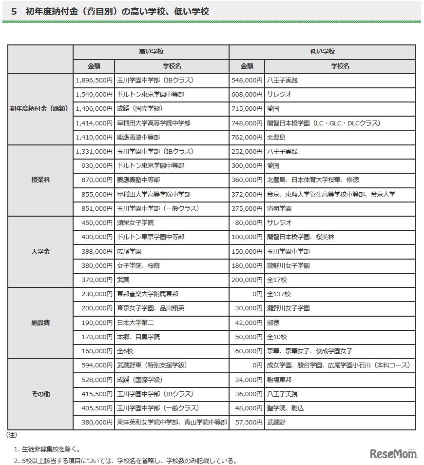 初年度納付金(費目別)の高い学校、低い学校