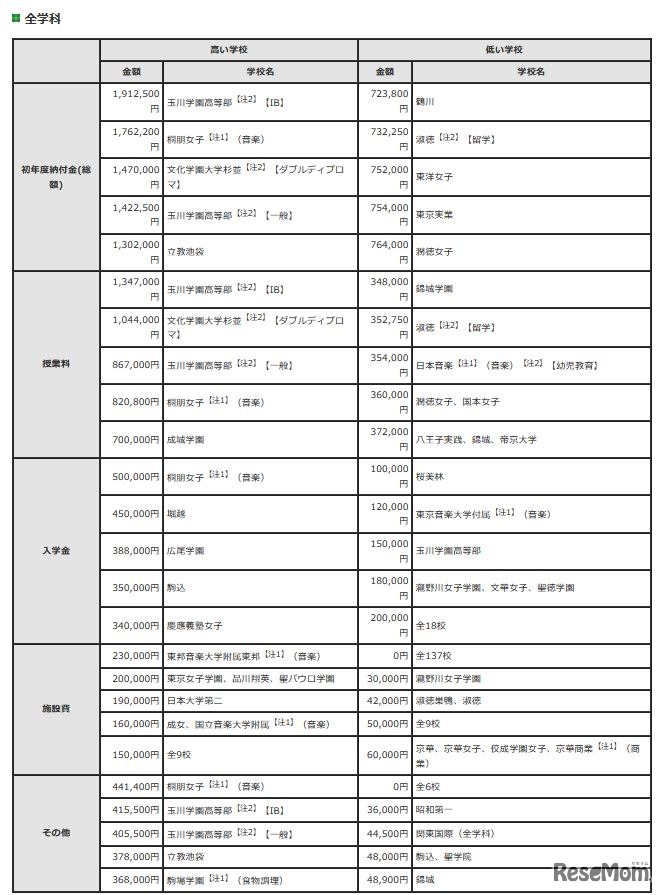 初年度納付金の高い学校、低い学校(全学科)