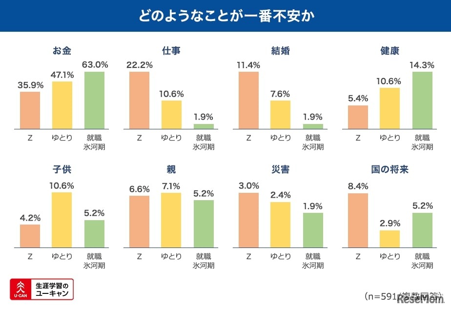 ユーキャンは、Z世代、ゆとり世代、就職氷河期世代の3世代で、仕事や資格に対する意識にどういった違いがあるのかを明らかにするため、2021年11月2日~8日、10代から50代の男女591名を対象に意識調査を実施した。