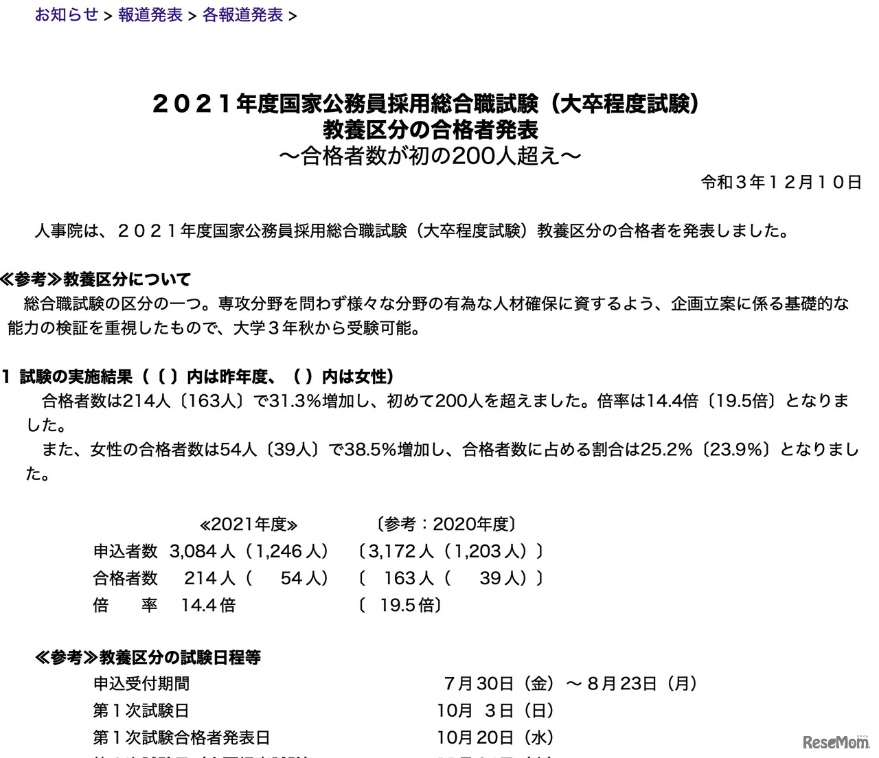 人事院は2021年12月10日、国家公務員採用総合職試験(大卒程度試験)教養区分の合格者を発表した。申込者数は3,084人、合格者数は214人、倍率は14.4倍。合格者数は前年度(2020年度)と比べて31.3%増加した。