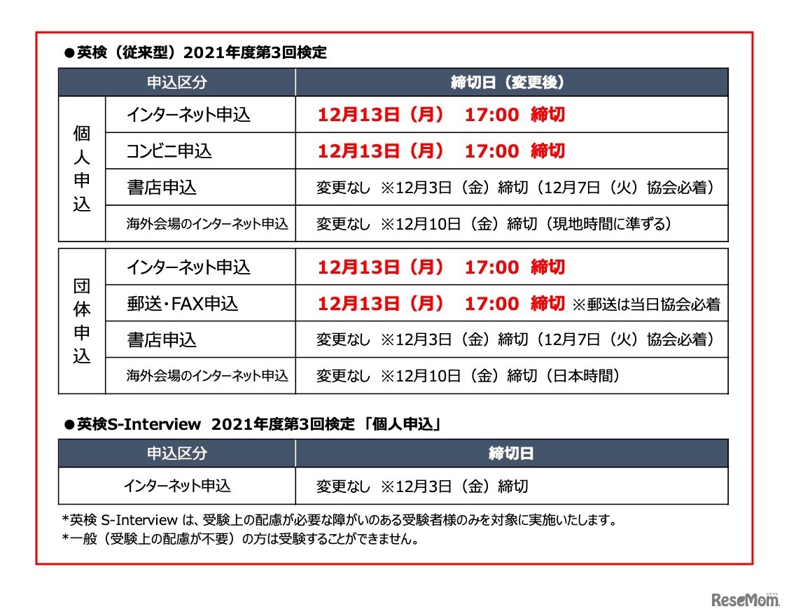 画像出典:日本英語検定協会 英検(従来型)2021年度第3回の締切日延長について