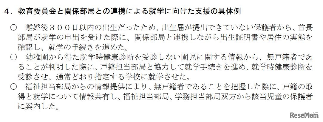 画像出典:文部科学省「無戸籍の学齢児童生徒の就学状況に関する調査結果」 教育委員会と関係部局との連携による就学に向けた支援の具体例