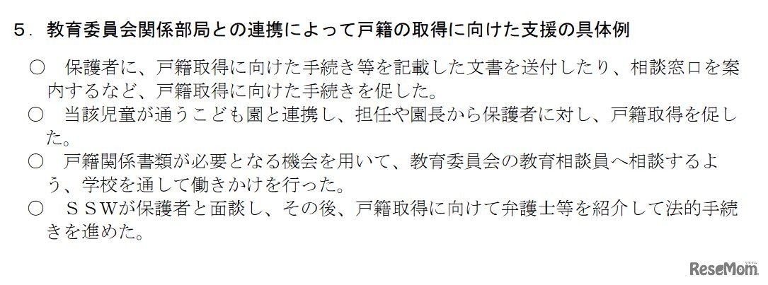 2021年5月10日時点で法務省が把握している無戸籍の学童児童生徒190人のうち、就学が確認できていない53人について文部科学省が調査したところ、すべての児童生徒の就学を確認したことがわかった。就学の徹底ときめ細かな支援に引き続き取り組むよう求めている。