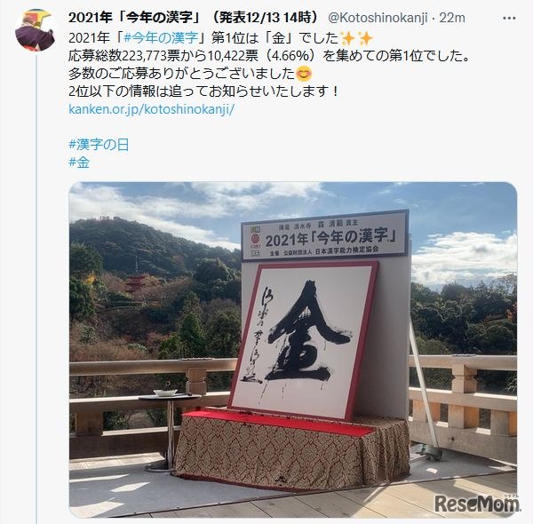 画像出典:日本漢字能力検定協会 2021年「今年の漢字」1位は「金」