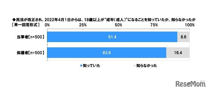 民法改正により2022年4月1日から18歳以上が成年(成人)となることを知っている人は、当事者91%、保護者84%であることが、ソニー生命保険の調査結果からわかった。成年年齢引下げに対する気持ちは、当事者・保護者ともに「楽しみ」よりも「不安」が上回った。