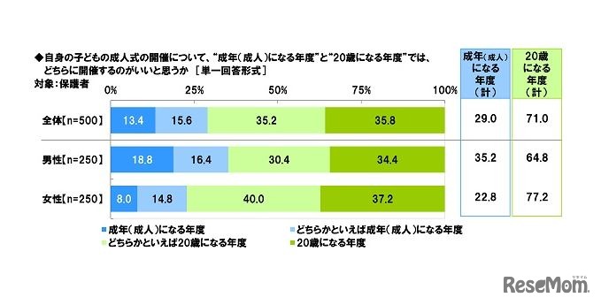 画像出典:ソニー生命保険 自身の子供の成人式の開催について、“成年(成人)になる年度”と“20歳になる年度”では、どちらに開催するのがいいと思うか