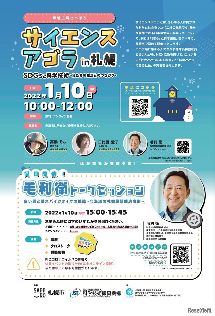 札幌市と科学技術振興機構は2022年1月10日、日本最大級の科学フォーラム「サイエンスアゴラin札幌」をオンラインにて開催する。今回は「SDGsと科学技術」がテーマ。また、同日に毛利衛トークセッション「白い雪と脱スパイクタイヤの挑戦」を対面とオンラインにて開催する。