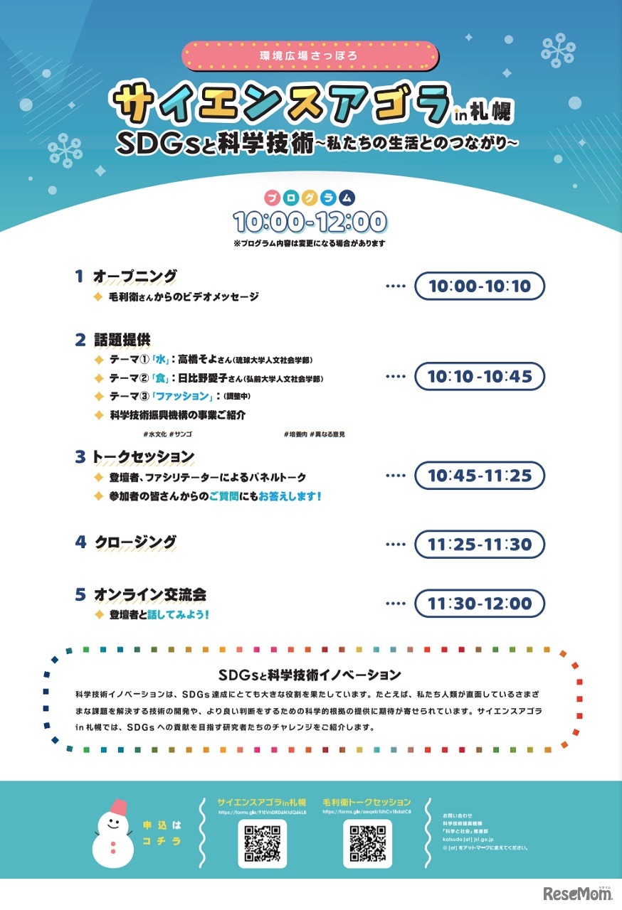 札幌市と科学技術振興機構は2022年1月10日、日本最大級の科学フォーラム「サイエンスアゴラin札幌」をオンラインにて開催する。今回は「SDGsと科学技術」がテーマ。また、同日に毛利衛トークセッション「白い雪と脱スパイクタイヤの挑戦」を対面とオンラインにて開催する。