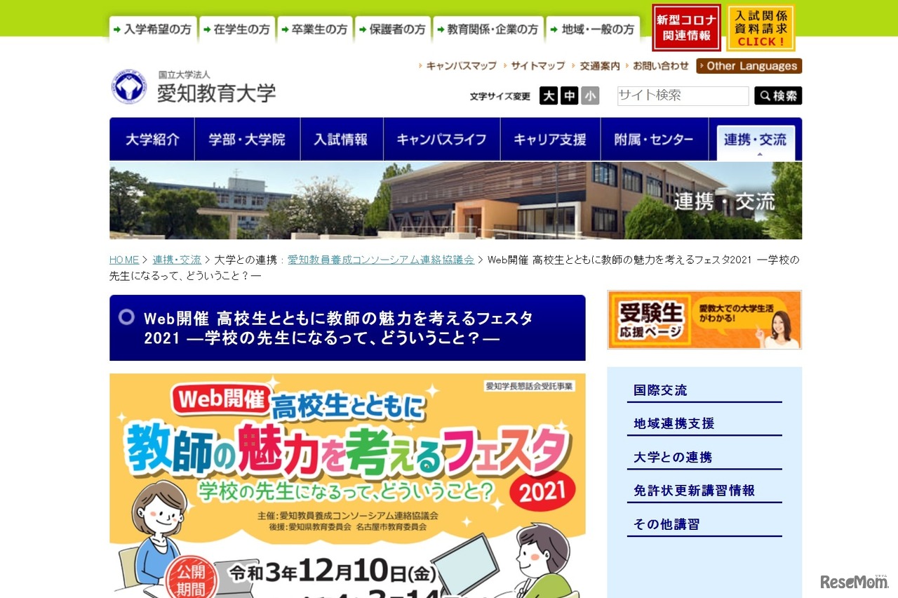 愛知教員養成コンソーシアム連絡協議会は2021年12月10日から、オンラインで「高校生とともに教師の魅力を考えるフェスタ2021」を開始。愛知教育大学Webサイトにて、基調講演、教員採用試験に合格した現役学生や若手教員によるメッセージ等の動画を公開している。