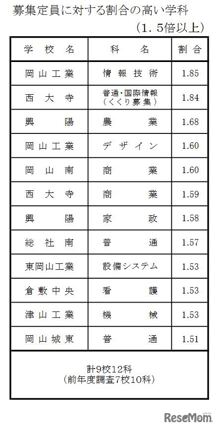 画像出典:岡山県教育委員会 募集定員に対する割合の高い学科(1.5倍以上)