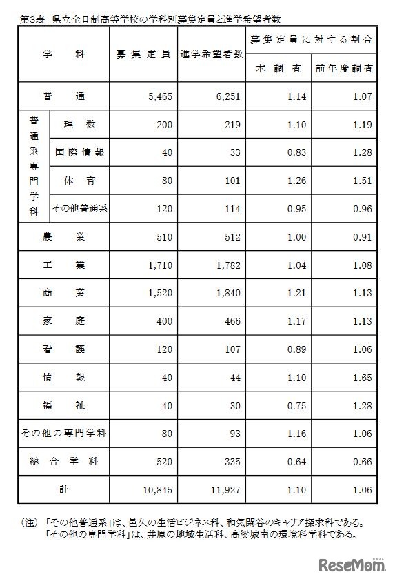 県立全日制高等学校の学科別募集定員と進学希望者数