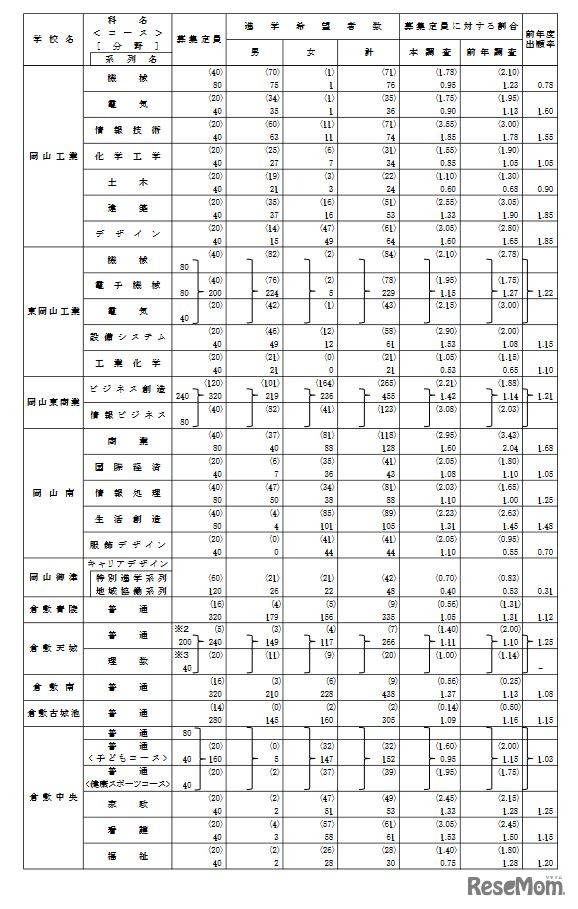 岡山県教育委員会は2021年12月15日、2022年3月中学校等卒業見込者の進路希望状況調査(第一次)の結果を発表した。学校・学科別の希望倍率では、岡山工業(情報技術)1.85倍、岡山城東(普通)1.51倍等が高かった。