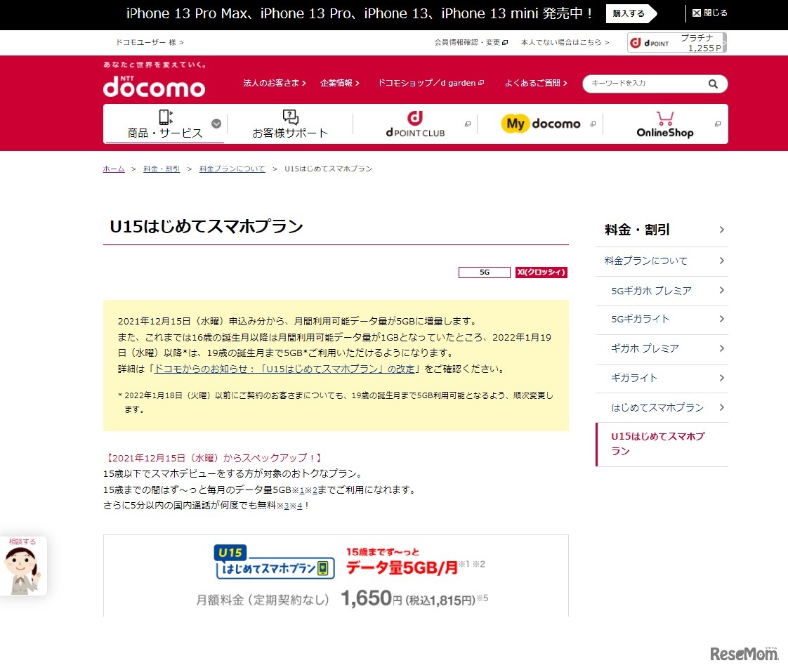 NTTドコモ(ドコモ)は2021年12月15日から、15歳以下を対象に提供している「U15はじめてスマホプラン」について、16歳の誕生月まで月間利用可能なデータ量を従来の3GBから5GBに改定した。さらに、2022年1月19日以降は、19歳の誕生月まで5GBが利用できるようになる。