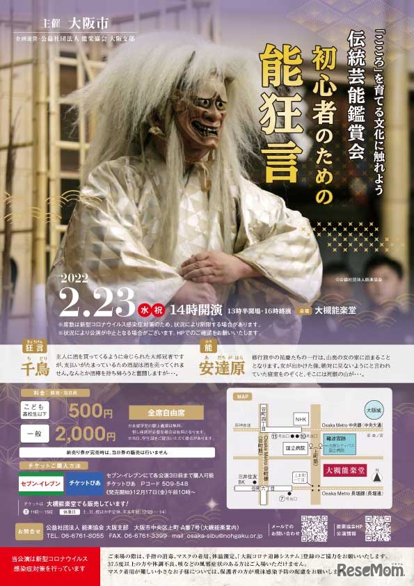 大阪市は、市民、特に青少年や伝統芸能初心者を対象に、2022年2月13日に「こどもとたのしむ能狂言」、2月23日に「初心者のための能狂言」を開催する。場所は大槻能楽堂。高校生以下はどちらの公演も500円(税込)で観ることができる。