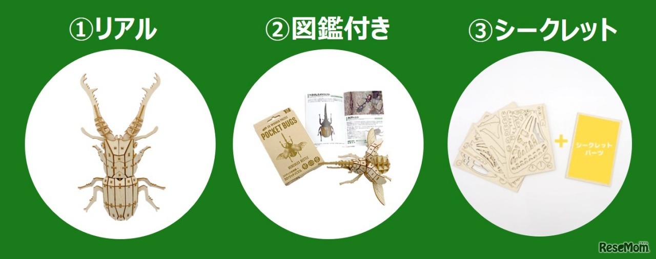 プラザクリエイトは、シリーズ累計出荷数120万個突破のDIYクラフトキット「つくるんです」から、昆虫図鑑が付いた3Dウッドパズルシリーズ「ポケットバグズ(通称:ポケバグ)」の第5弾4種を2021年12月17日より未来屋書店にて先行販売する。価格は各1,485円(税込)。