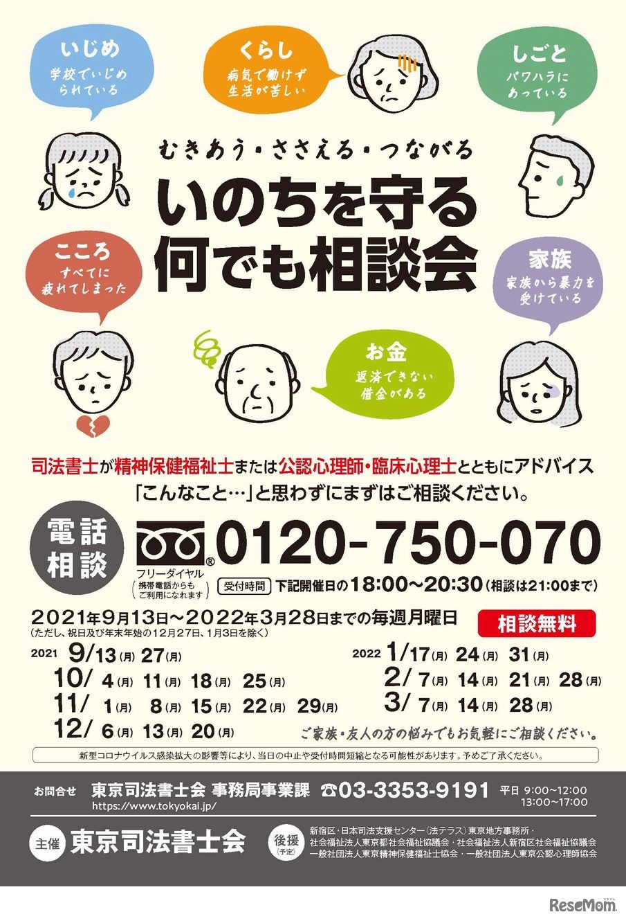 東京司法書士会は2022年1月17日から3月28日までの毎週月曜日、一般市民からの相談を受け自殺防止をはかるため、電話による「いのちを守る何でも相談会」を開催する。