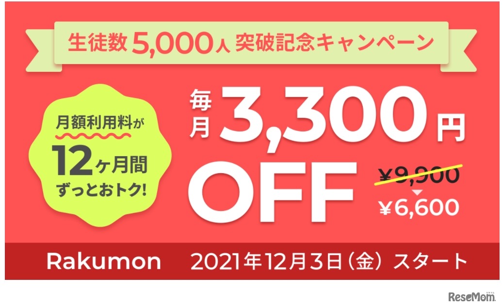 ラクモンが運営する、小中高校生及び大学受験生の自主学習を支援する質問アプリ「Rakumon(ラクモン)」。登録生徒数5,000人の突破を記念し、2021年12月3日から「生徒数5,000人突破記念キャンペーン」を開催する。