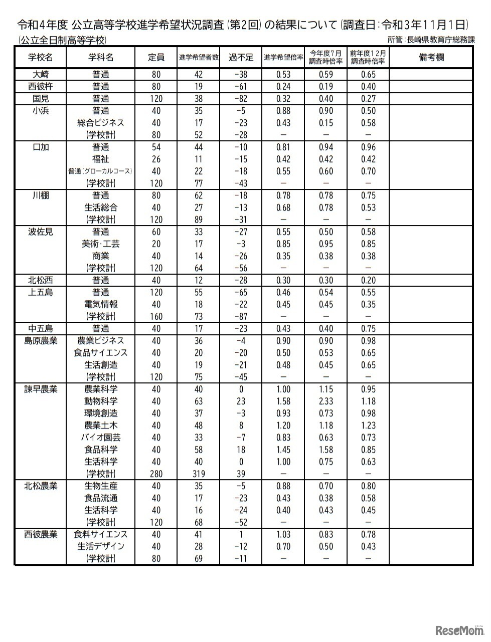 画像出典:長崎県 令和4年度公立高等学校進学希望状況調査(第2回)の結果について