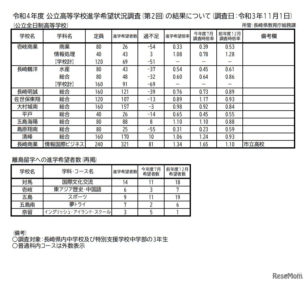 長崎県は2021年11月15日、県内の中学校および特別支援学校中学部の3年生を対象とした令和4年度(2022年度)公立高等学校進学希望状況調査(第2回)の結果を発表した。進学希望倍率がもっとも高いのは、長崎工業(情報技術)2.03倍であった。