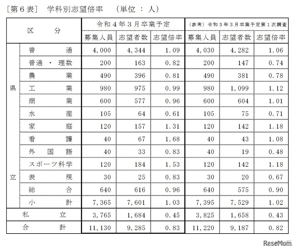 画像出典:青森県教育委員会「令和4年3月中学校等卒業予定者の進路志望状況報告書(第1次調査、令和3年11月10日現在)」 学科別志望倍率