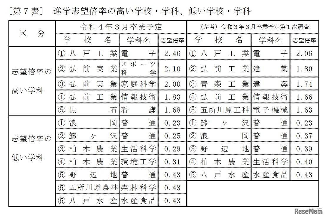 画像出典:青森県教育委員会「令和4年3月中学校等卒業予定者の進路志望状況報告書(第1次調査、令和3年11月10日現在)」 進学志望倍率の高い学校・学科、低い学校・学科