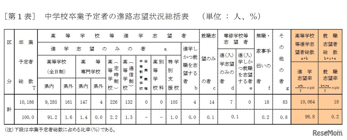 画像出典:青森県教育委員会「令和4年3月中学校等卒業予定者の進路志望状況報告書(第1次調査、令和3年11月10日現在)」 中学校卒業予定者の進路志望状況総括表