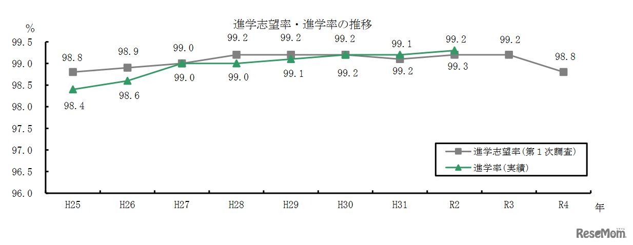 画像出典:青森県教育委員会「令和4年3月中学校等卒業予定者の進路志望状況報告書(第1次調査、令和3年11月10日現在)」 進学志望率・進学率の推移