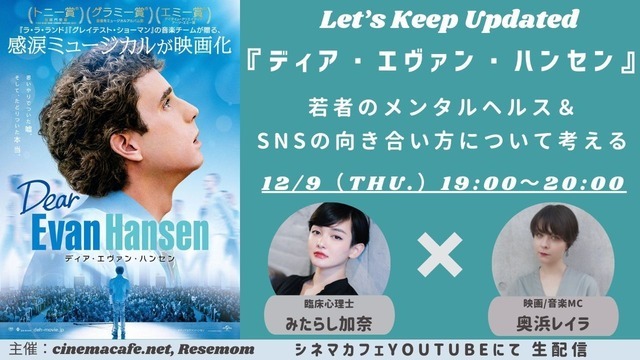 シネマカフェ×リセマムの共催オンラインイベント「Let’s Keep Updated」は、映画『ディア・エヴァン・ハンセン』をメインに、若者のメンタルヘルスやSNSとの向き合い方について考えた。奥浜レイラさんとみたらし加奈さんの対談のようすをお届けする。
