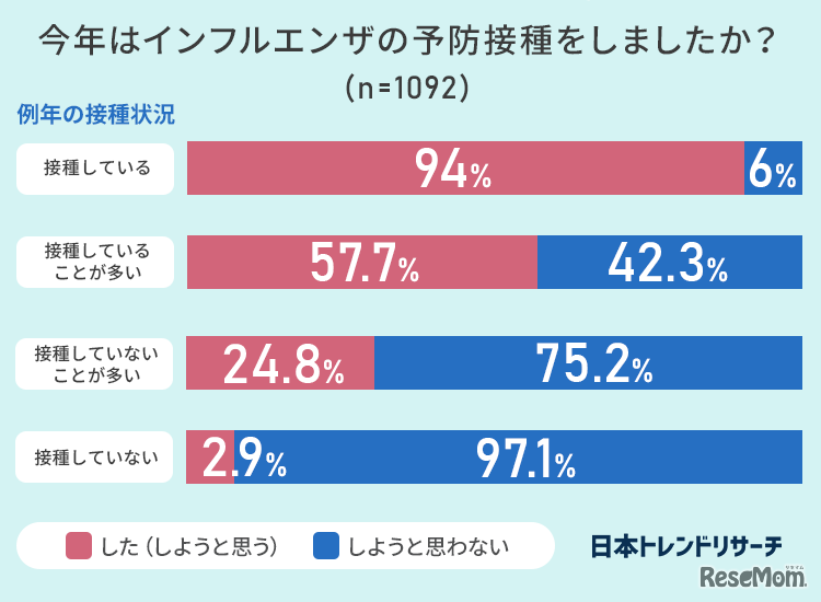 新型コロナワクチンの3回目接種が話題となる中、NEXERが運営する日本トレンドリサーチは、インフルエンザ予防接種に関するアンケート結果を公開。2021年は、60.4%がインフルエンザ予防接種を「しようと思わない」と回答した。